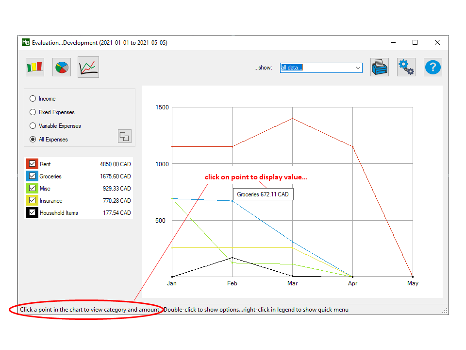 The status bar at the bottom of the window shows you always some hints of what to do...e.g. when you click at a point in the Development chart, the category name and value is shown next to the point...