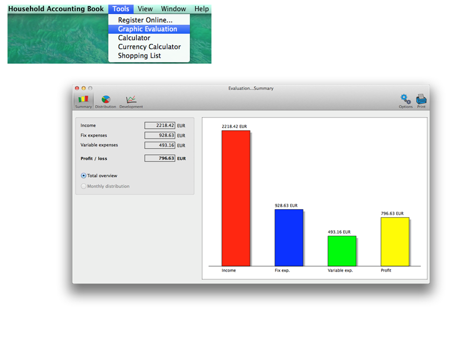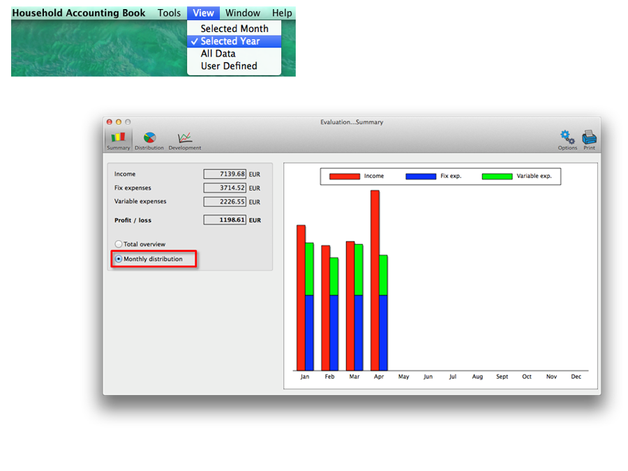 ...In the "View" menu you can select the period of time for which you would like to show the charts. If you select a time span of several months (e.g. "Selected year") for the chart "Overview", you can show this chart also as "Monthly distribution"...