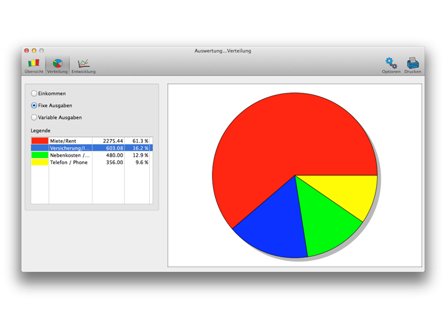 Wählen Sie die Darstellung "Verteilung", wird Ihnen eine Torten- bzw. Säulengrafik der Zusammensetzung der Einnahmen oder Ausgaben angezeigt.