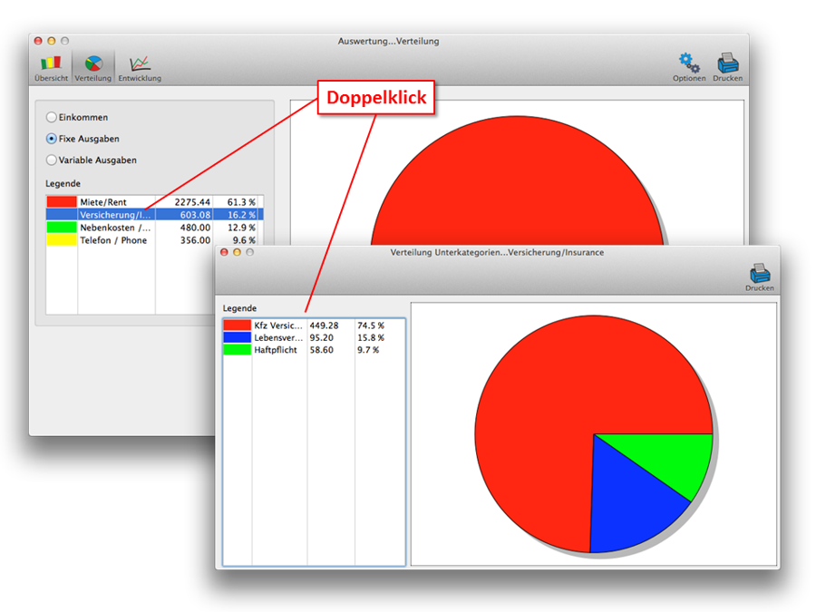 Um die Verteilung der Unterkategorien einer bestimmten Kategorie anzuzeigen, doppelklicken Sie einfach den Eintrag in der Legende und es öffnet sich ein weiteres Fenster das die Zusammensetzung dieser Kategorie anzeigt...