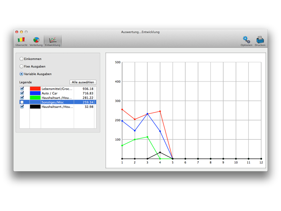 Eine weitere interessante Funktion zur Analyse Ihrer Daten ist die "Entwicklung" Ihrer Einnahmen bzw. Ausgaben. Hier wird der Verlauf einer bestimmten Kategorie über dem entsprechenden Zeitraum dargestellt...
