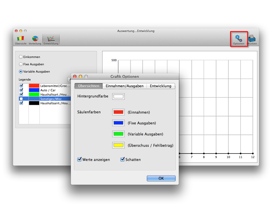 Klicken Sie den Button "Optionen" um die Einstellungen aller Grafiken an Ihre persönlichen Bedürfnisse anzupassen. Hier können Sie Arten von Diagrammen, Farben, Schattierungen, Gitternetzlinien usw. einstellen.