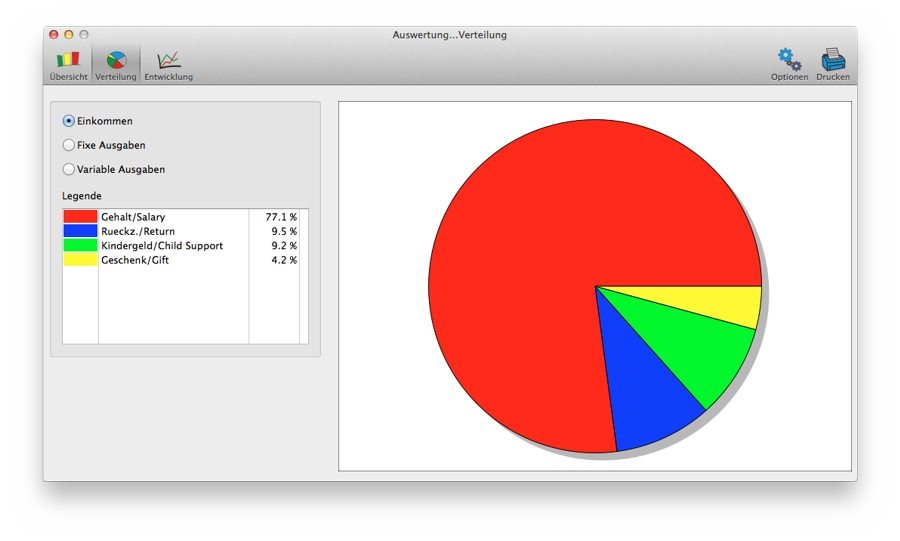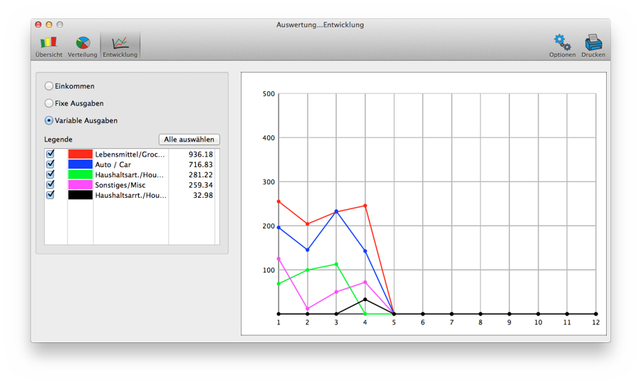 Mit der Vollversion kann auch die zeitliche Entwicklung einzelner Kategorien Ihrer Einnahmen und Ausgaben (z.B. über ein Kalenderjahr) angezeigt werden.
