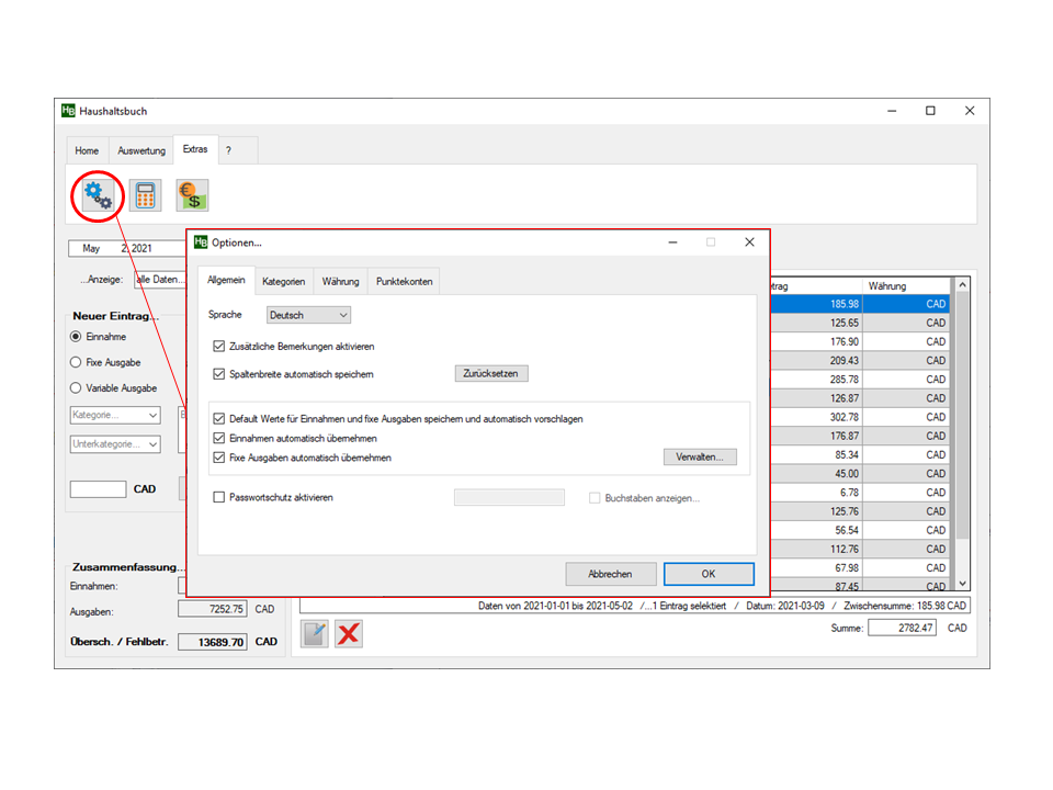 Wenn die Option "Default-Werte für Einnahmen und fixe Ausgaben speichern" aktiviert ist, werden eingegebene Beträge für Einnahmen und fixe Ausgaben gespeichert und bei der nächsten Eingabe automatisch vorgeschlagen. Wenn die beiden Häkchen darunter ("Fixe Ausgaben / Einnahmen automatisch übernehmen") gesetzt sind, geht der Automatismus noch einen Schritt weiter.