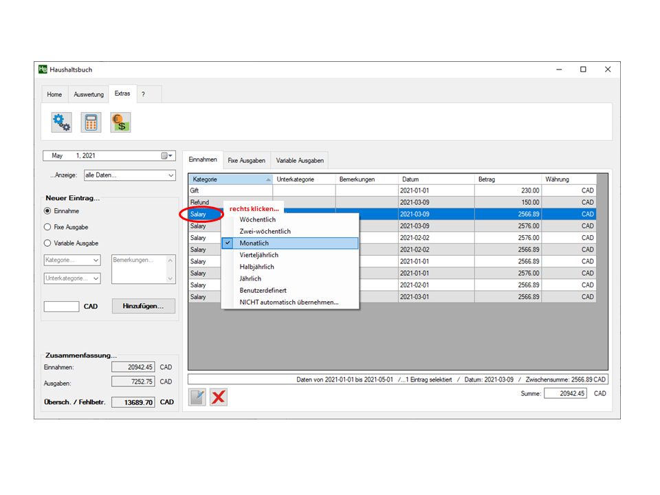 ...Wenn Sie nun den entsprechenden Eintrag im Hauptfenster dann markieren und die rechte Maustaste klicken, können Sie das Intervall (monatlich, vierteljährlich, jährlich usw.) für die automatische Übernahme festlegen. Sie können natüürlich auch mit diesem Kontextmenü den entsprechenden Eintrag aus dem Automatismus entfernen indem Sie den Punkt "NICHT automatisch übernehmen" wählen.