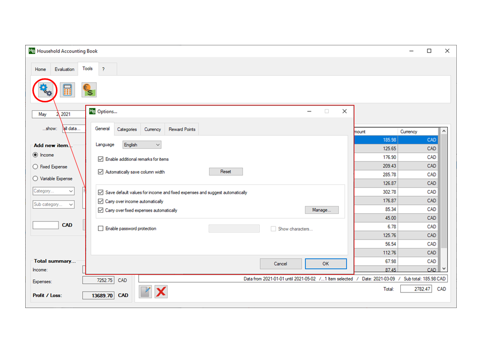 Checking the box "Enable additional remarks for items" will give you an additional text field for any remarks that you might want to enter for each item. If the option "Save default-values for income and fixed expenses" is checked, the corresponding amounts that you enter will be saved and automatically suggested the next time you enter an item.