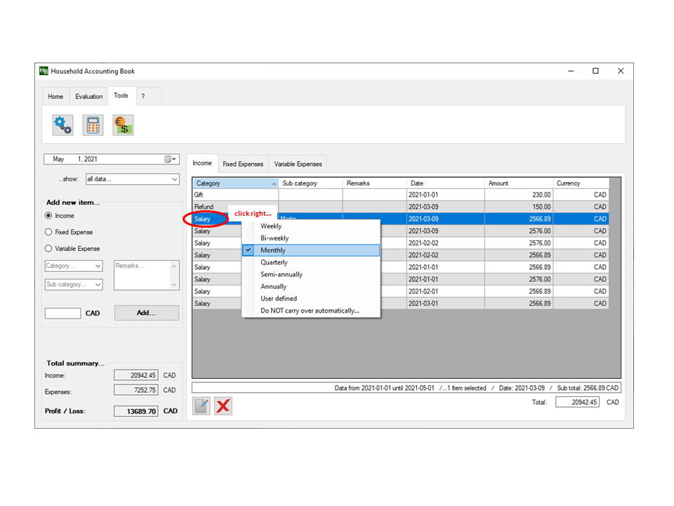 ...In the main window, mark the corresponding item in the table and click the right mouse button to adjust the interval (monthly, quarterly, annual etc.) for the automated carry-over. You can also delete the specific item from the automatic carry-over by selecting "do NOT carry over automatically" in the context menu.