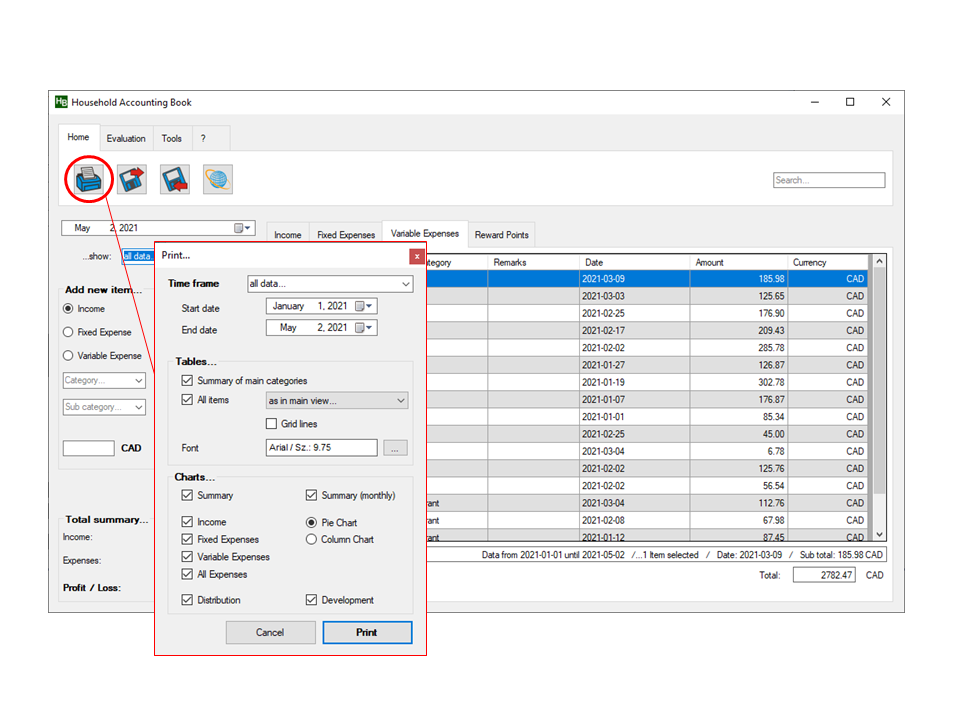 You can also print your data into detailed reports. To do so, click the button "Print" from the "Home" menu. A dialog-window will appear which gives you more opportunities to adapt the printout to your personal needs. Select your preferences and execute the printout by pressing the "Print" button. The printed document will contain tables as well as graphic overviews of the data you selected...