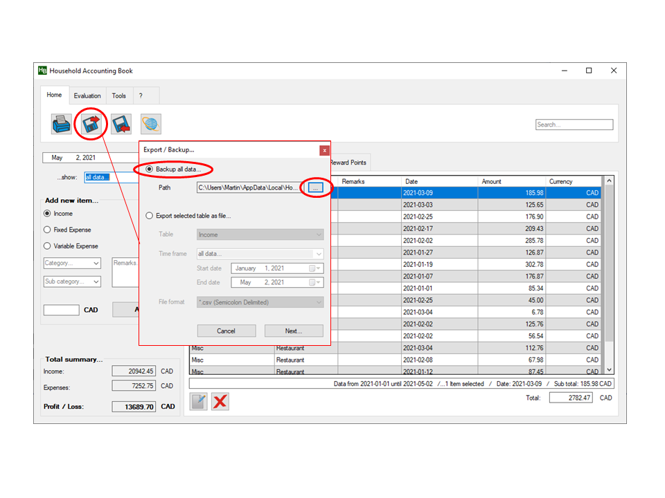 With the button "Export / Backup" you can create a backup of your data or export your data in *.txt, *.csv or *.html format. Select the option "Backup all data..." to generate a backup of all your data at the current point in time. You can choose where you want to save this data set by clicking the "..." button.