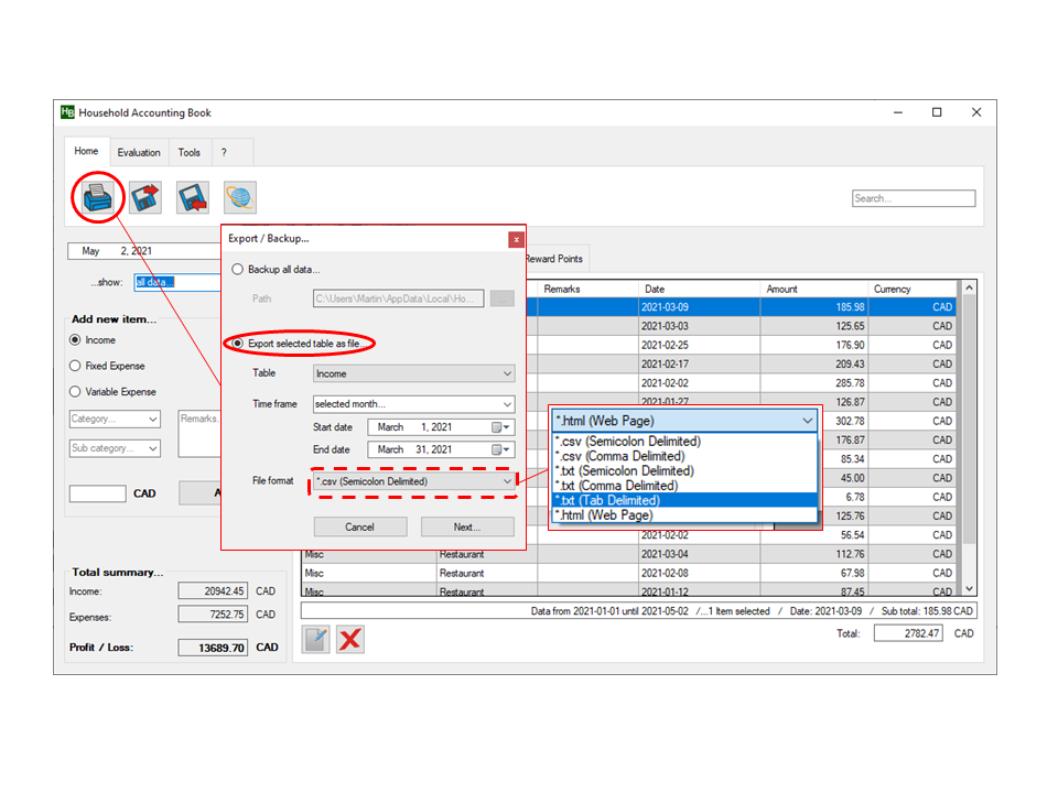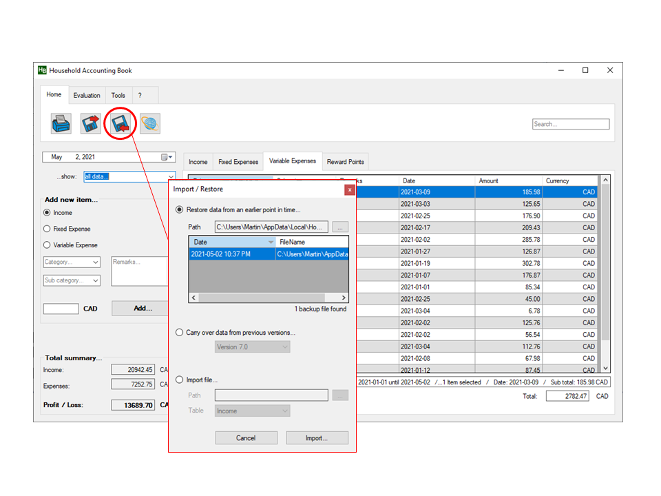 The backup data can be restored at any point in the future. Simply click the "Import" button. You will now see a table listing all backup data with the corresponding date that could be found on your hard drive. Select the data you want to restore your accounting book to and confirm with "Import". All data will be restored to this point in time (NOTE: all data entered after this date will be permanently deleted).
