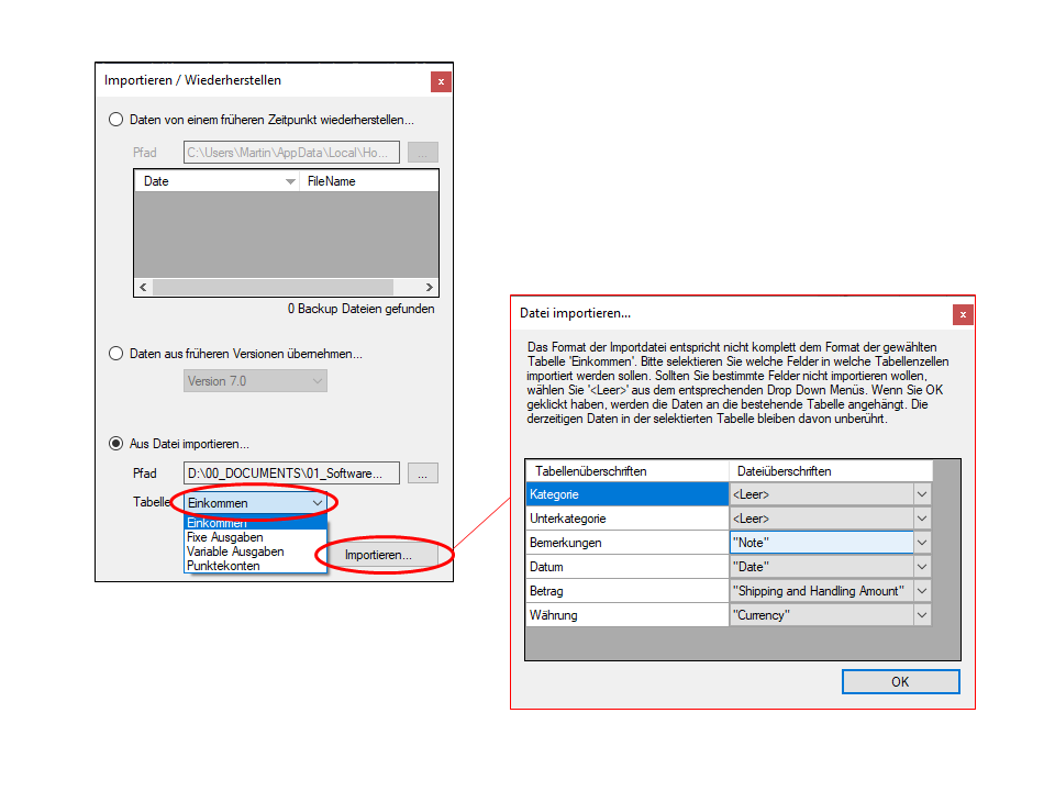In diesem Fenster können Sie das Format der Haushaltsbuch Tabelle (Tabellenüberschriften) dem Format der Importdatei (Dateiüberschriften) zuordnen...wählen Sie welce Dateiüberschrift zu welcher Tabellenüberschrift korrespondiert aus dem Drop-Down Menü. Wenn Sie verschiedene Zellen der Importdatei ignorieren wollen, selektieren Sie einfach <Leer>.