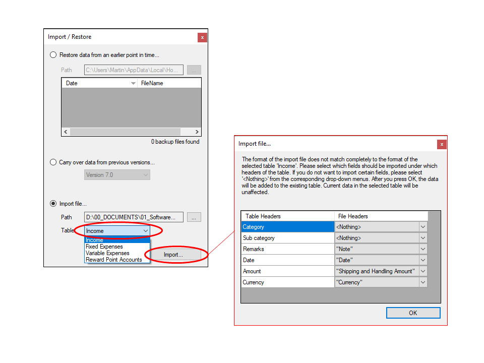 In this window the format of the Household Accounting Book table (Table Headers) can be matched to the headers of the import file (File Headers)...select which file header should go with which table header by choosing from the drop down cells. If you want to ignore a certain column of the import file...simply select <Nothing>.
