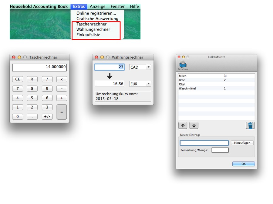 Den Taschenrechner mit einfachen mathematischen Operationen wie z.B. Subtraktion, Addition oder Prozentrechnung, können Sie für Zwischenrechnungen nutzen. Mit dem Währungsrechner können Sie Beträge von einer (gespeicherten) Währung in die andere umrechnen. Zum Hinzufügen bzw. Ändern von Währungen wählen Sie im Hauptmenü