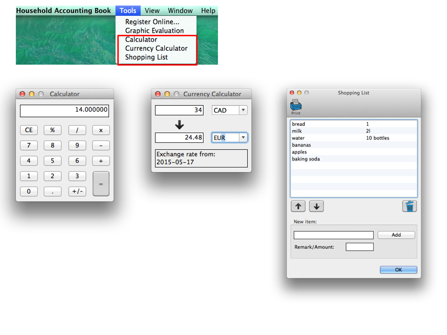 Household Accounting Book offers you several useful supplementary functions in the "Tools" menu.